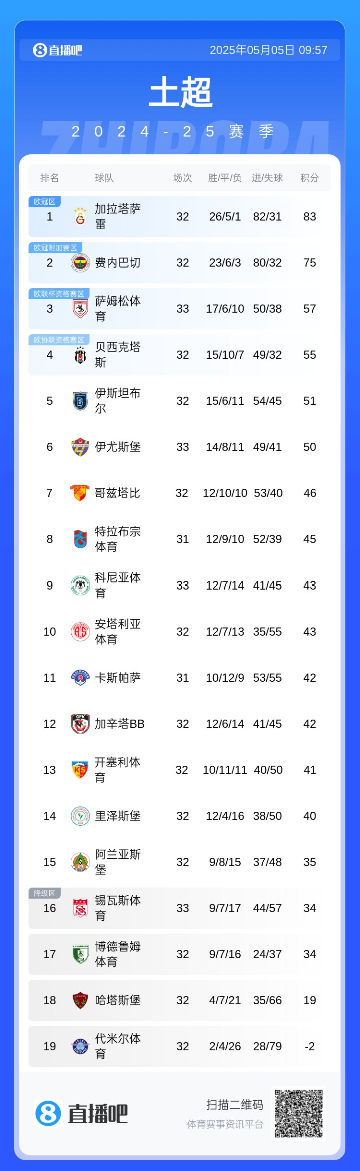 穆帅争冠难! 土超积分榜: 费内巴切遭索帅阻击, 剩4轮落后榜首8分